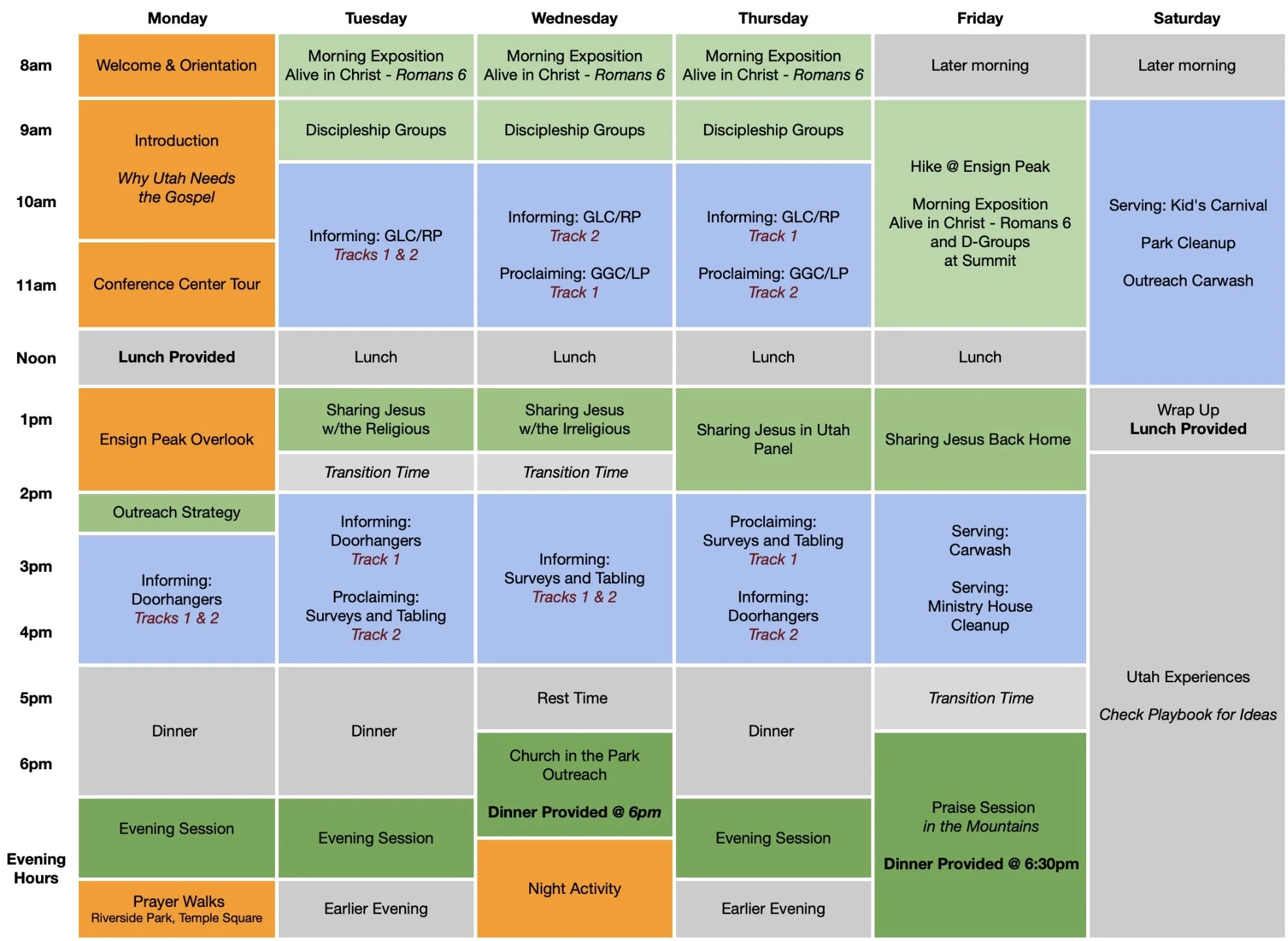 Please reach out to admin@plant4thegospel.com if you have questions about the specific emphases of this year's weeks.